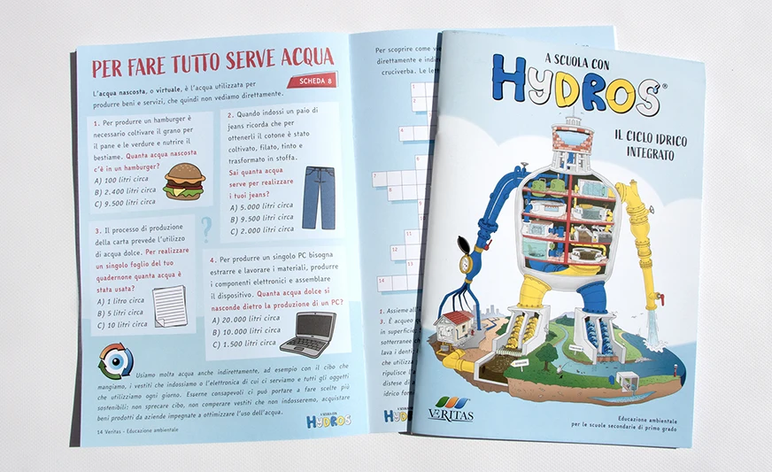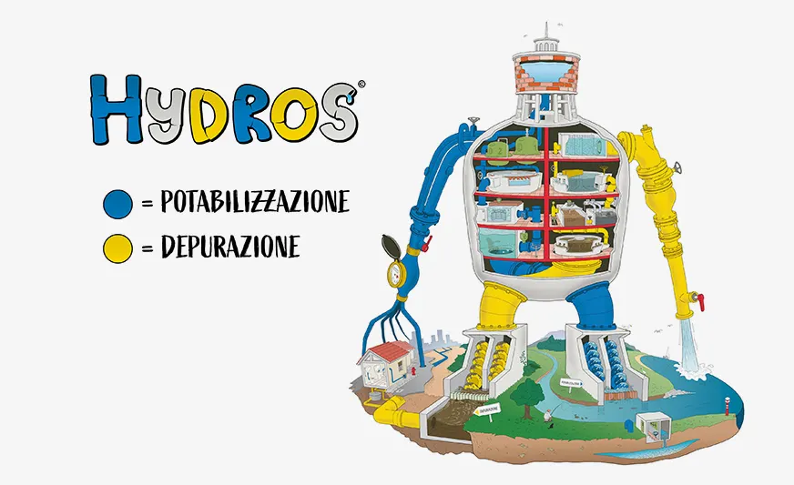 Hydros è un gigantesco robot che racchiude tutti i segreti e le tecnologie che ci permettono di utilizzare ogni giorno l’acqua potabile. Con Hydros approfondiamo la conoscenza del ciclo idrico integrato, l’insieme delle attività che riguardano la gestione dell’acqua dalla sua origine fino al suo ritorno all’ambiente naturale. È un concetto fondamentale per comprendere come l’acqua venga prelevata, trattata, distribuita, utilizzata e poi depurata, garantendo che sia sicura per l’ambiente e le persone. La gestione dell’acqua è un tema molto attuale e può diventare un’occasione per approfondire quanto affrontato in materie come scienze, geografia ed educazione civica, stimolando riflessioni su ambiente, territorio, responsabilità e futuro.