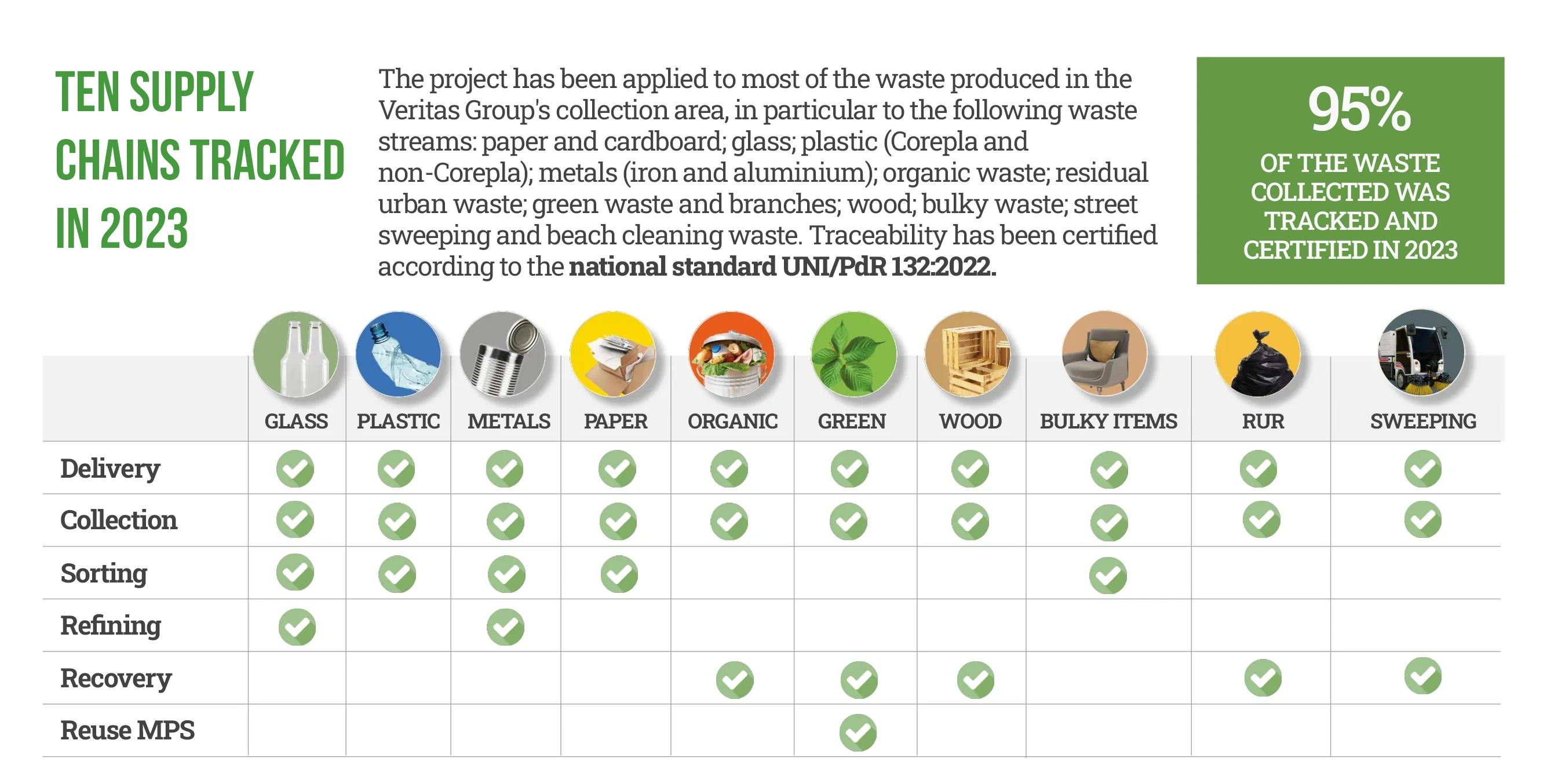 To ensure maximum transparency, Veritas has traced the waste supply chains. This means that all waste and materials collected separately are tracked, monitored, measured, and recorded from the moment of delivery to their treatment and reuse.